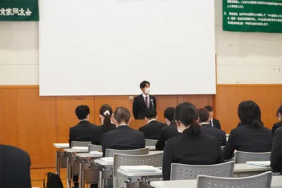 式では、新入社員代表としサンキョウ新入社員が堂々とスピーチ!フレッシュな想いがしっかり伝わる、とても素敵な挨拶でした。また、先輩社員として登壇した入社4年目のサンキョウ社員からのメッセージも印象的で、自身の経験をもとに「働くとは何か」を語る姿に、聞いているこちらも改めて考えさせられました。